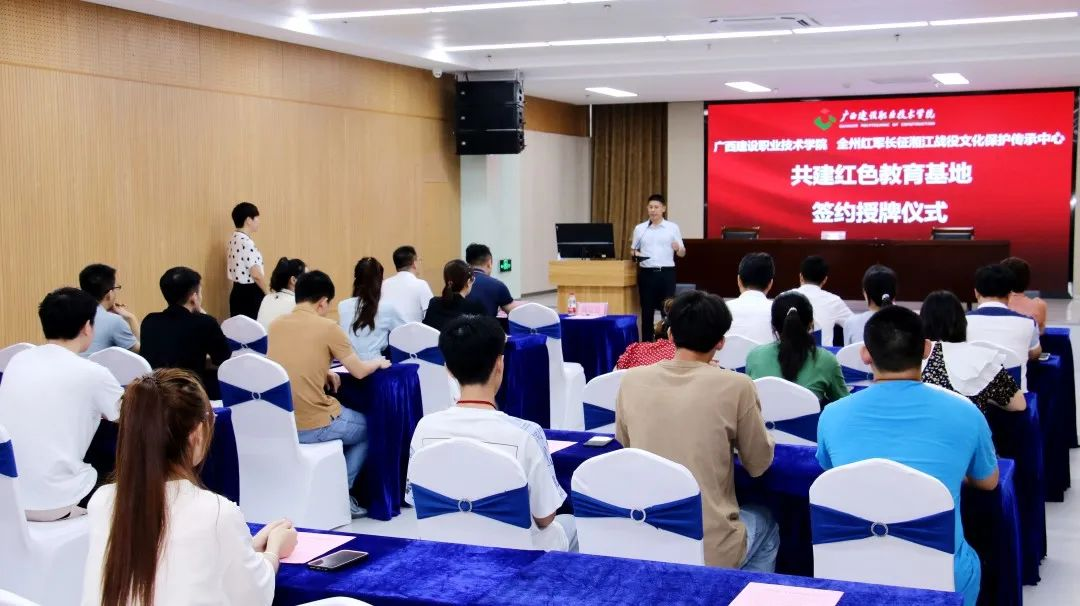 廣西建院6月10日訊(黨委學生工作部 文/唐紅星 宋霞 圖/馬凱)為深入學習貫徹習近平新時代中國特色社會主義思想,探索構建常態化館校合作機制,讓青年學生從湘江戰役中汲取精神營養和榜樣力量,6月8日,我校與全州紅軍長征湘江戰役文化保護傳承中心在學校黨建思政教育基地舉行共建紅色教育基地簽約授牌儀式,儀式由紅星工作室承辦。學校副校長伍耿清,全州紅軍長征湘江戰役文化保護傳承中心主任、紅軍長征湘江戰役紀念館館長、“全國紅色旅游五好講解員”...