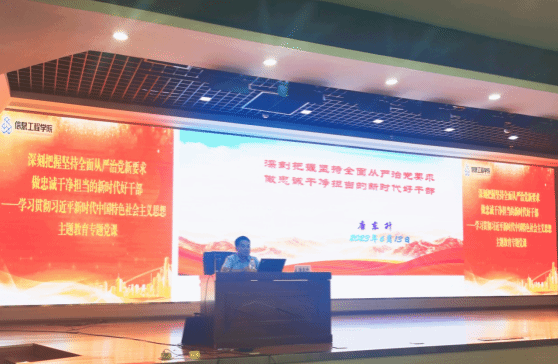 廣西建院6月14日訊(信息工程學院?徐田保)為推動學習貫徹習近平新時代中國特色社會主義思想主題教育走深走實,激勵和引導黨員干部把學習熱情轉化為攻堅克難、干事創業和開拓創新的強大動力,6月13日,學校紀委書記唐東升在四教二樓報告廳為信息工程學院教職工、學生代表以及學校紀檢監察干部作了題為《深刻把握堅持全面從嚴治黨要求做忠誠干凈擔當的新時代好干部》的專題黨課。唐東升書記圍繞深刻把握堅持全面從嚴治黨要求、清醒認識堅持全面從嚴治黨面臨新風險、...