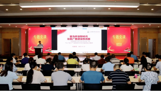 廣西建院6月17日訊(黨委學生工作部 文/宋霞 圖/余骦 馬凱)6月16日下午,學校副校長伍耿清以《奮力開創新時代壯美廣西建設新局面》為題,在四教二樓報告廳為學校直屬第四、第五黨支部全體黨員上黨課。?專題黨課現場?伍耿清副校長作專題講課伍耿清副校長深情回顧了黨的十八大以來,習近平總書記對廣西發展給予的親切關懷和殷切囑托,重點圍繞學習貫徹落實習近平總書記對廣西“五個更大”重要要求和視察廣西“4·27”重要講話精神,系統闡釋了“...
