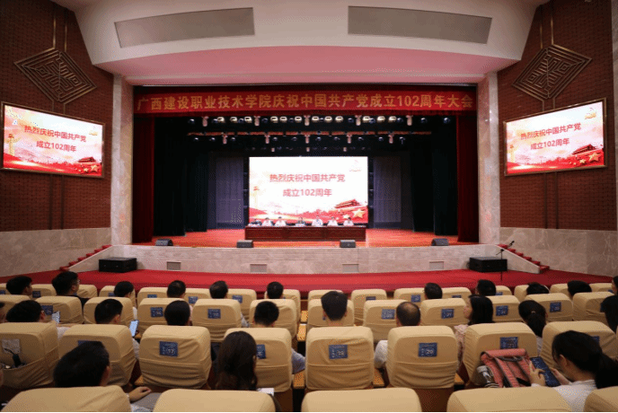 廣西建院6月27日訊(文/黨委宣傳部 陳熙 圖/黨委宣傳部 韋植巍 記者團 楊貴維 鐘田 阮倩)為慶祝中國共產黨成立102周年,6月27日下午,我校在禮堂召開慶祝建黨102周年大會。會議旨在回顧黨的光輝歷程,謳歌黨的豐功偉績,激勵各級基層黨組織大力弘揚偉大建黨精神,深入學習貫徹習近平新時代中國特色社會主義思想和黨的二十大精神,凝聚學校高質量發展的磅礴力量。會上,新黨員進行了入黨宣誓,其他黨員重溫了入黨誓詞。會議為老黨員高作均、...