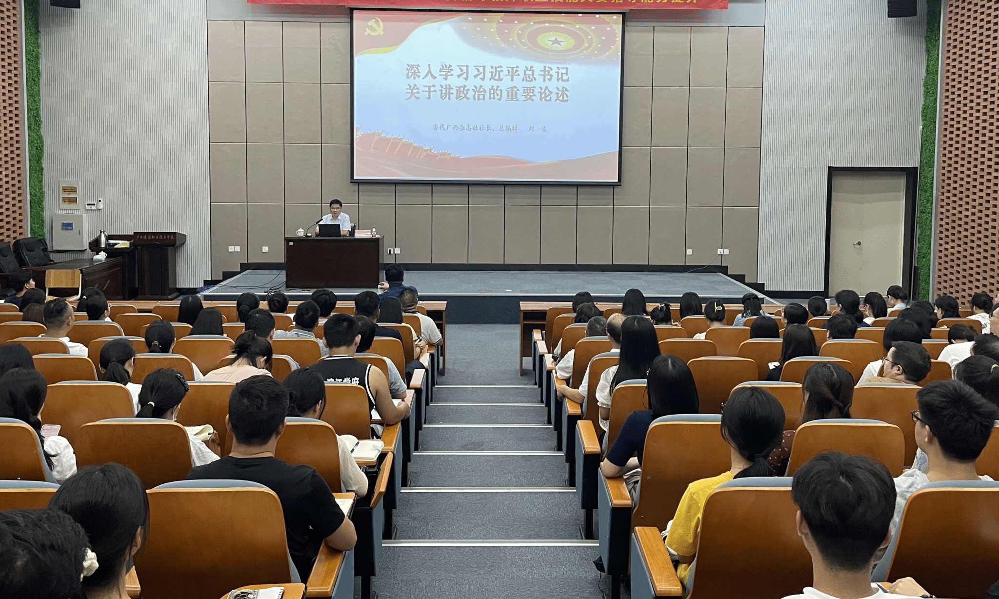 廣西建院9月6日訊(馬克思主義學院 曹桃)為深入學習習近平總書記關于講政治的重要論述,9月5日,我校邀請當代廣西雜志社社長、總編輯劉波在6教3樓報告廳開展專題講座,全體思政課教師、輔導員、學生黨員代表以及學生入黨積極分子代表到會聽講。講座由馬克思主義學院黨總支書記、院長邱嵐主持。劉波社長緊緊圍繞習近平總書記關于講政治的重要論述,從旗幟鮮明講政治是馬克思主義政黨的根本要求、黨的政治建設是黨的根本性建設、把新時代講政治的要求內化于心外化于行三個方面進行闡述,...