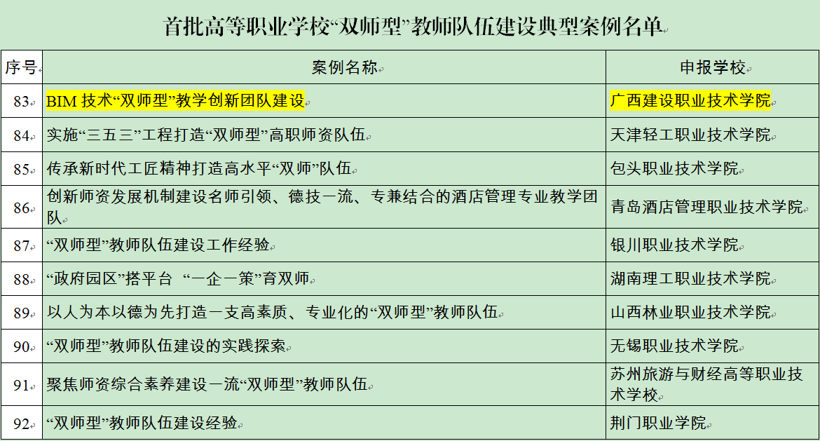 廣西建院5月7日訊(土木工程系 唐未平)近日,教育部教師工作司公布首批全國職業院校“雙師型”教師隊伍建設典型案例名單,廣西僅3所高職院校入選,其中,我校《BIM技術“雙師型”教學創新團隊建設案例》成功入選。 ...
