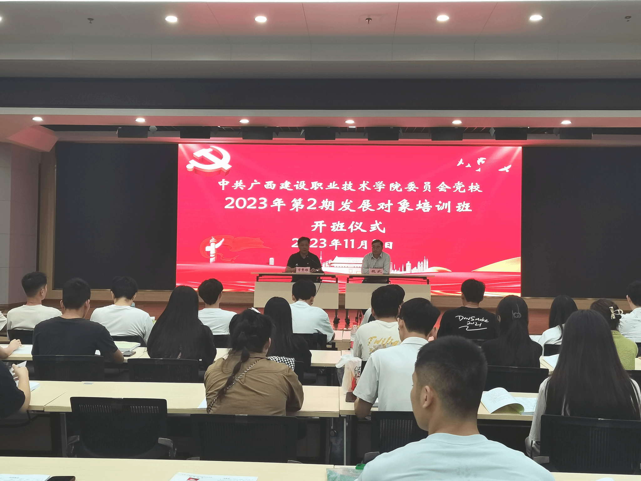 廣西建院11月6日訊(黨委組織部 張玉燕)為貫徹落實習近平新時代中國特色社會主義思想和黨的二十大精神,加強對黨員發展對象的教育培訓,根據《中國共產黨發展黨員工作細則》和學校發展黨員工作安排,經過前期充分準備,中共廣西建設職業技術學院委員會黨校2023年第2期發展對象培訓班于11月3日至5日在學校四教二樓報告廳舉辦。來自各二級學院黨總支、直屬黨支部和校屬企業黨委共80名發展對象參加培訓。培訓以理論授課、社會實踐等多種方式開展,...