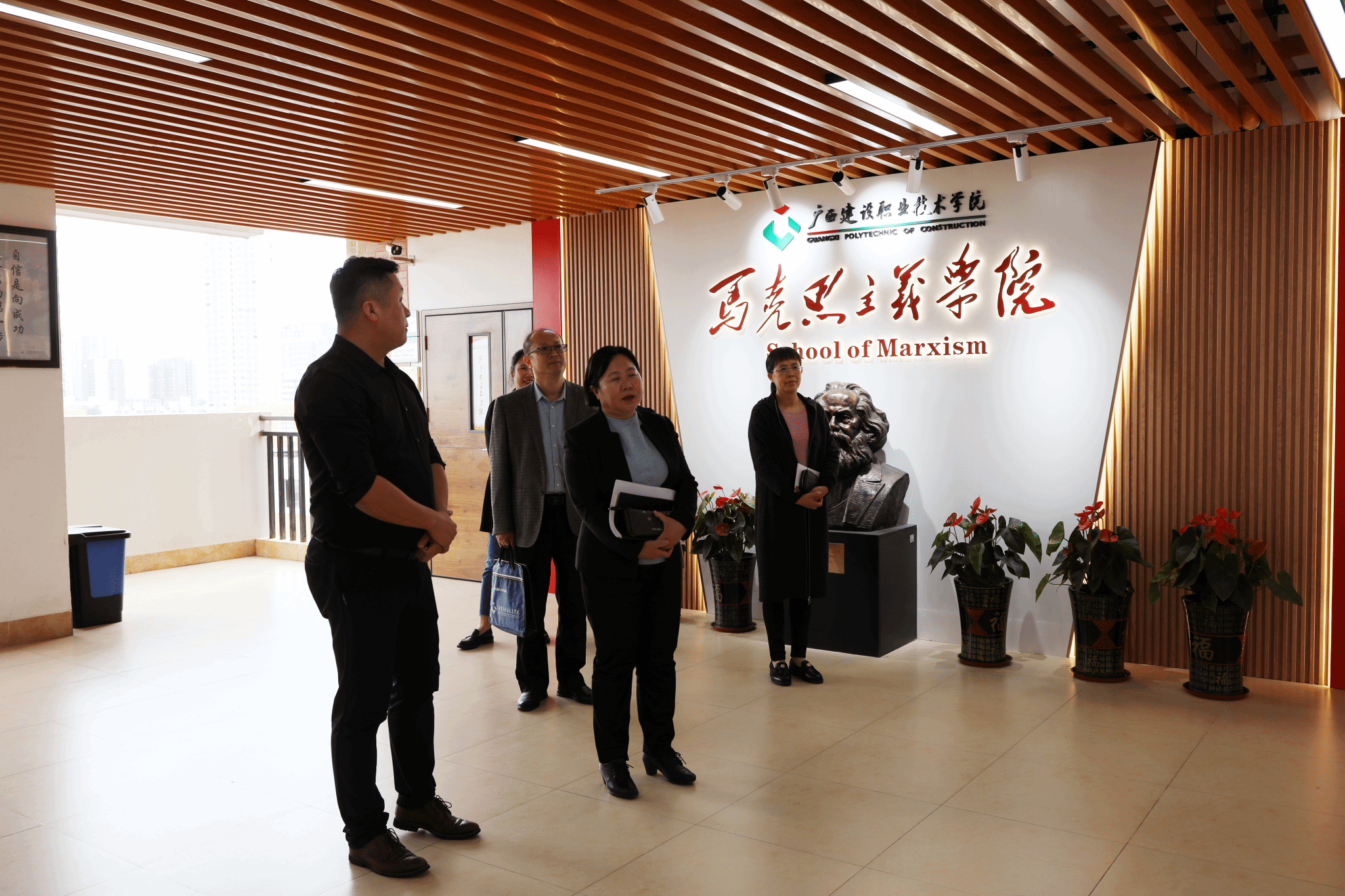 廣西建院11月15日訊(文/馬克思主義學院 曹桃 ?圖/黨委宣傳部 韋植巍) 11月14日下午,學校黨委書記劉曉紅來到馬克思主義學院調研,并在3號教學樓703會議室召開現場辦公會暨思政課教師座談會。學校黨委辦公室、黨委組織部(黨委統戰部、黨委教師工作部、人事處)、教務處領導陪同調研,馬克思主義學院領導班子成員、全體思政課教師參加座談。馬克思主義學院黨總支書記、院長邱嵐代表學院對校領導一行的到來表示熱烈歡迎,并匯報了學院思政課教師隊伍建設和思政課改革的基本情況。...