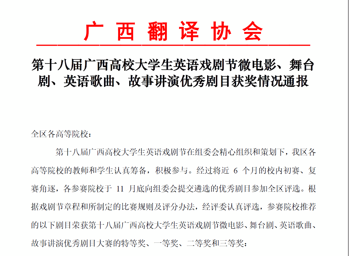 廣西建院12月16日訊(人文教育學院 盧森源)近日,由廣西高校外語教育研究專業委員會協同廣西翻譯協會主辦的第十八屆廣西高校大學生英語戲劇節圓滿落幕。在我校英語教研團隊的帶領和人文教育學院盧森源老師的精心指導下,建筑與規劃學院學子黃川越喜獲故事講演劇目特等獎,陳志杰、毛嘉慧斬獲故事講演劇目一等獎,江雨霏榮獲歌曲演唱比賽一等獎。此番成績刷新了歷年來我校參與該項賽事的最佳記錄。 第十八屆英語戲劇節獲獎文件故事講演劇目特等獎截圖故事講演劇目一等獎截圖歌曲演唱劇目獲一等獎截圖特等獎劇目《...