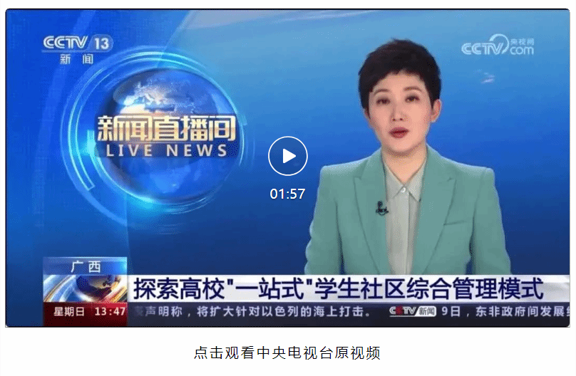 廣西建院12月12日訊(黨委學生工作部 黃楚凌)12月10日,中央電視臺CCTV-13新聞頻道《新聞直播間》欄目以《廣西探索高校“一站式”學生社區綜合管理模式》為題報道廣西高校開展“一站式”學生社區的建設成果,其中以我校在學生社區開展大學生創意集市活動為切入點,展現了我校在“一站式”學生社區綜合管理模式建設中的創新探索與多元實踐。節目畫面我校學生在“一站式”學生社區參加“大學生創意創業集市”實踐活動我校學生在“一站式”...