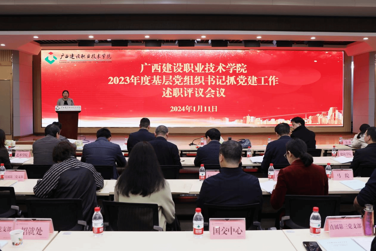 廣西建院1月13日訊(文/黨委宣傳部 韋植巍 圖/記者團 唐元庭)1月11日下午,我校2023年度基層黨組織書記抓黨建工作述職評議會在四教二樓報告廳召開,學校領導,各二級學院黨政主要負責人,各部門主要負責人,各二級黨組織書記、專職組織員,廣西建筑科學研究設計院、廣西城鄉規劃設計院、廣西城建咨詢設計有限公司黨政主要負責人及黨辦主任參加會議。學校黨委書記劉曉紅主持會議并講話。會議現場述職評議會上,17個二級黨組織書記分別對照“...
