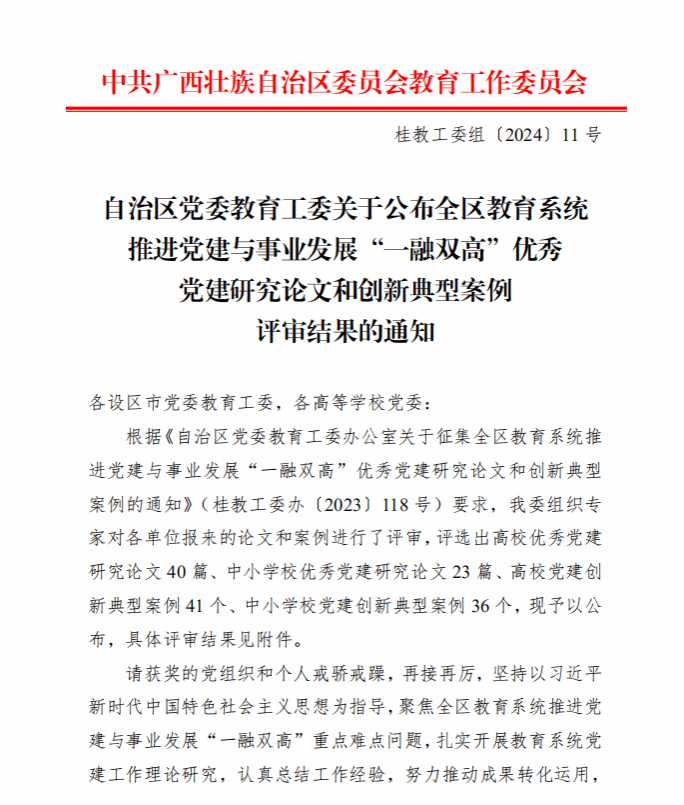 廣西建院4月10日訊(馬克思主義學院 曹桃) 近日,自治區黨委教育工委公布了全區教育系統推進黨建與事業發展“一融雙高”優秀黨建研究論文和創新典型案例評審結果,我校馬克思主義學院教師范崢、邱嵐、宋佳雄的論文《“一融雙高”賦能廣西高校青年黨務干部隊伍建設研究》榮獲優秀黨建研究論文一等獎?!丁耙蝗陔p高”賦能廣西高校青年黨務干部隊伍建設研究》一文緊扣新時代全區高校青年黨務干部隊伍建設,強調“IPv6+一融雙高”,依據馬克思主義問題導向、...