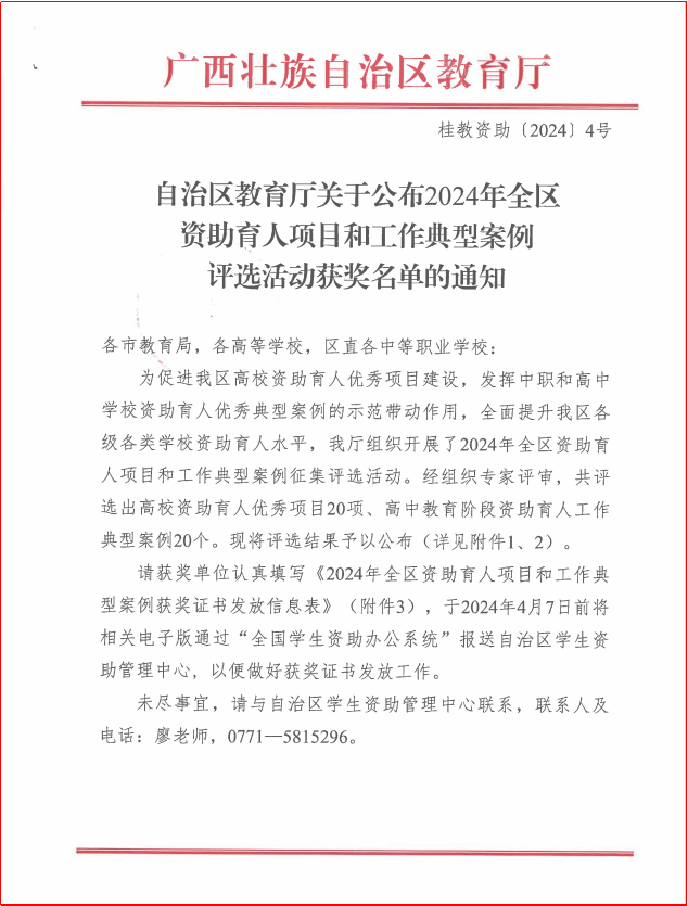 廣西建院4月7日訊(黨委學生工作部 歐嘉卡 楊棟)近日,自治區教育廳印發《關于公布2024年全區資助育人項目和工作典型案例評選活動獲獎名單的通知》(桂教資助〔2024〕4號),在全區高校范圍內共評選出資助育人優秀項目20項。我校申報的項目《家庭經濟困難學生專業考證獎學金》榮獲“2024年全區高校資助育人優秀項目”三等獎。文件通知“家庭經濟困難學生專業考證獎學金”項目以“資助+實踐”為理念,以“資助為抓手,育人為導向”的工作思路,...
