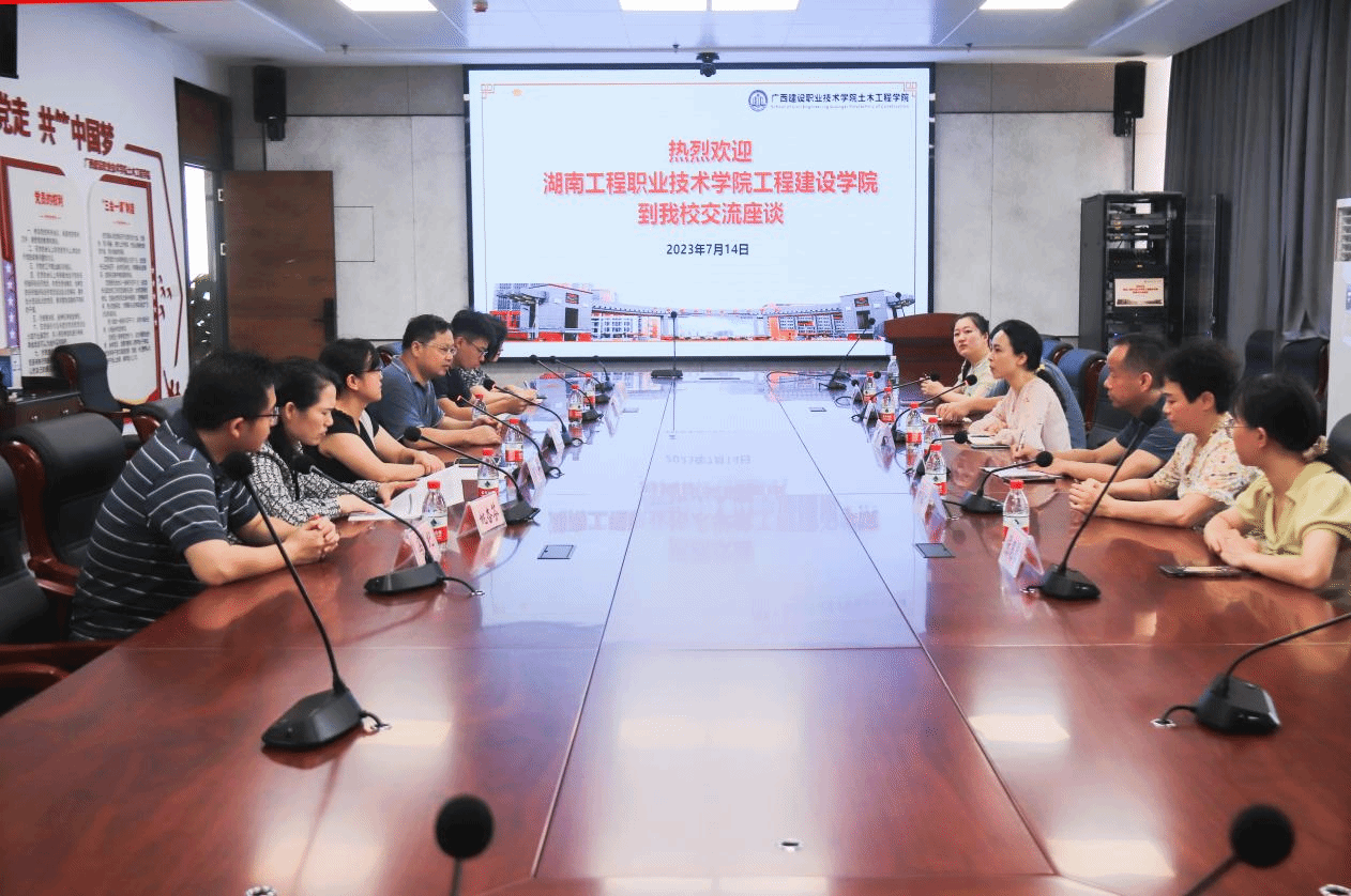 廣西建院7月15日訊(土木工程學院 馮耀紀 李盛福)7月14日,湖南工程職業技術學院建筑工程技術專業教研室主任田欣妮一行7人到學校土木工程學院座談交流。土木工程學院辦公室主任唐未平、裝配式建筑工程技術專業教學團隊帶頭人劉學軍教授、市政與交通學院姚杏芬教授、智能建造技術專業教學團隊帶頭人黃平等老師在5教10樓會議室熱情接待了來賓。座談會上,唐未平主任對田欣妮主任一行表示熱烈歡迎。劉學軍教授和姚杏芬教授分別代表土木工程學院和市政與交通學院簡要介紹了兩個二級學院在黨建工作、...
