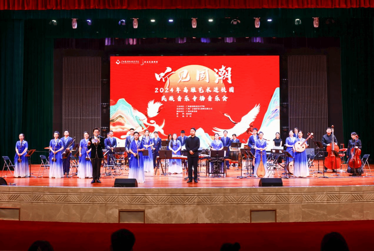 廣西建院10月18日訊(融媒體中心 文/劉露 葉銖銖 圖/甘盧燁宇 李承宏 溫麗雯)音樂是一場無聲的對話,一幅有聲的畫卷,一場心靈的旅程。由廣西建設職業技術學院主辦、廣西廣文電影發行放映有限公司承辦的“聽見國潮”2024年高雅藝術進校園民族音樂專場音樂會于10月17日晚在我校禮堂精彩上演,現場師生共同徜徉音樂殿堂,共同享受藝術盛宴。音樂會現場,廣西民族樂團以氣勢磅礴、具有感染力的《象王行》拉開帷幕,把觀眾帶入千軍萬馬、...