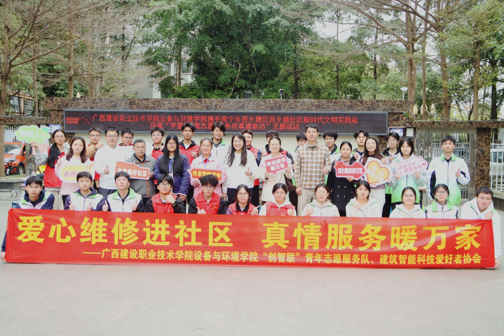廣西建院3月30日(設備與環境學院 文/農靜芳 徐靜 圖/譚曉穎 李兆健)近日,設備與環境學院團總支攜手西鄉塘社區到金龍公寓社區開展“愛心維修進社區,真情服務暖萬家”學雷鋒志愿服務活動,28名大學生志愿者懷揣著滿腔熱忱前往金龍公寓社區開展義務維修志愿服務活動,設備與環境學院教工黨支部、學生黨支部黨員代表也一同前往參加活動。活動當天,西鄉塘社區書記黃麗曉對設備與環境學院青年志愿服務隊的到來表示了熱烈的歡迎,在活動現場,...