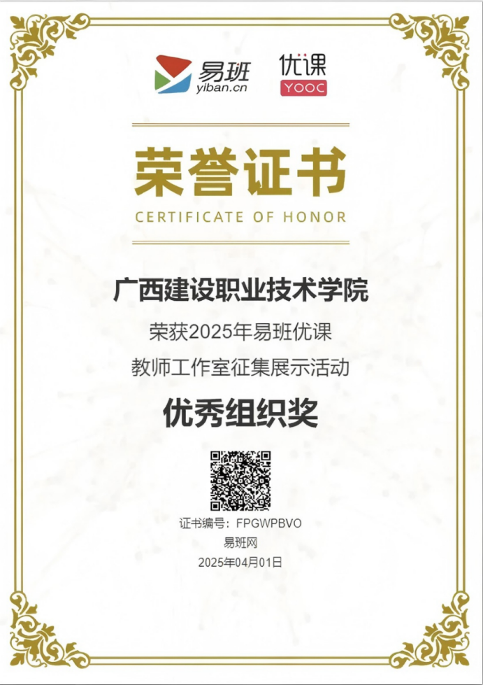廣西建院4月16日訊(通訊員 劉晗蓓)近日,教育部易班發展中心公布2025年易班優課教師工作室征集展示活動評審結果。廣西建設職業技術學院在本次活動中表現突出,共有3個教師工作室成功通過全國審核,進入展示環節,學校榮獲“優秀組織獎”。 本次該校入選的3個教師工作室分別為:學生社區網絡思政工作室(課群邀請碼:JNHD8YA6),由學生工作部劉晗蓓老師主持,依托“弘德育才學堂”“寶藏建院”兩大網絡思政品牌項目,以紅色文化和校園文化中的育人元素為切入點,...