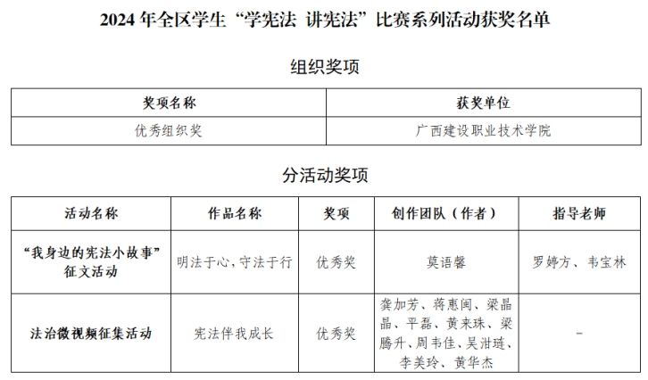 廣西建院4月21日訊(黨委學生工作部 韋寶林)近日,自治區教育廳、自治區司法廳、自治區科協公布2024年全區學生“學憲法 講憲法”系列活動獲獎名單,我校喜獲2024年全區學生“學憲法 講憲法”系列活動“優秀組織獎”,藝術設計學院莫語馨同學創作的征文作品《明法于心,守法于行》獲評“我身邊的憲法小故事”征文活動優秀獎;信息工程學院師生團隊創作的視頻作品《憲法盼我成長》榮獲法治微視頻征集活動優秀獎。 獲獎名單一直以來,...