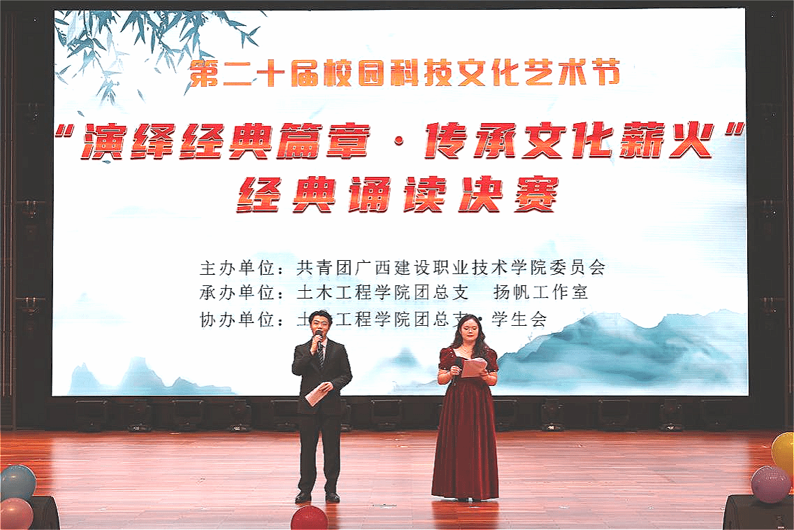 為弘揚中華優(yōu)秀傳統(tǒng)文化,打造校園原創(chuàng)文化品牌,近日,由校團委主辦,土木工程學院團總支和揚帆工作室聯(lián)合承辦的第二十屆校園科技文化藝術(shù)節(jié)經(jīng)典誦讀比賽決賽在學校禮堂舉行。黨委學生工作部、土木工程學院領(lǐng)導老師出席活動,2024級全體學生參加此次比賽。決賽現(xiàn)場 節(jié)目表演《土木八桂邊疆情》《土木學子規(guī)》經(jīng)典誦讀比賽作為學校“一院一品”品牌,以傳統(tǒng)經(jīng)典《弟子規(guī)》為藍本,融入土木學科專業(yè)特色與新時期思政教育內(nèi)涵,分為 “...