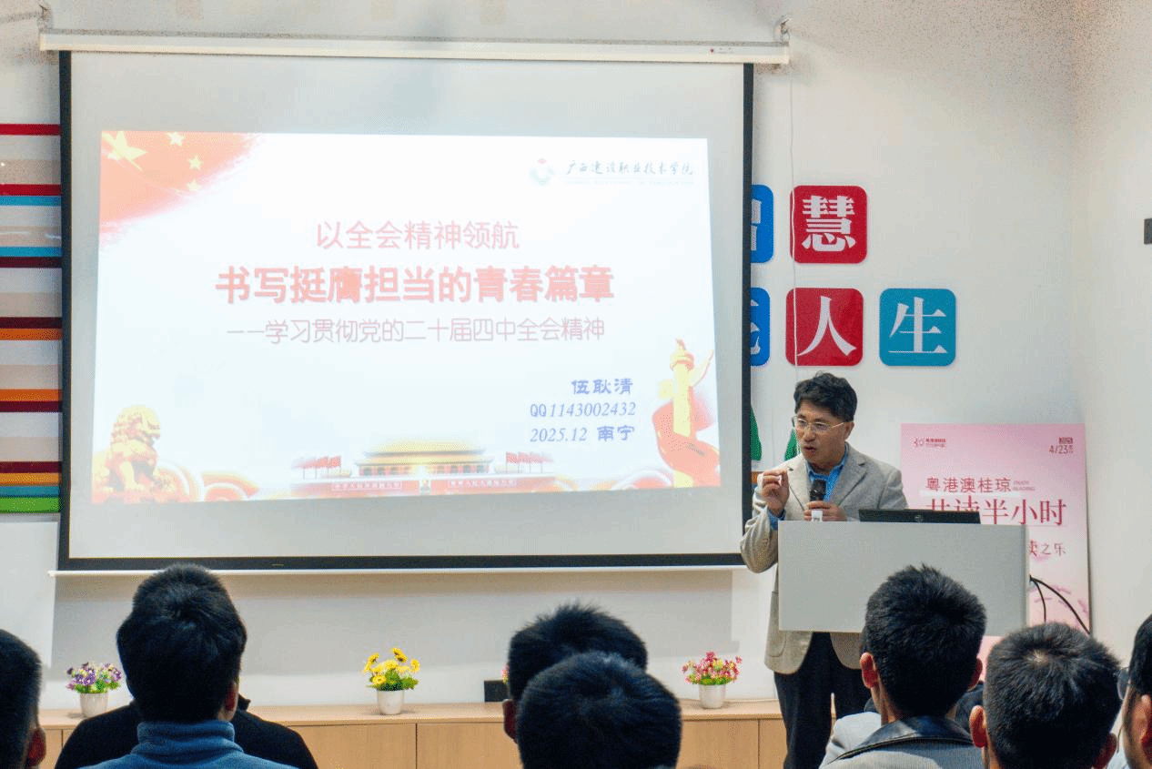 為深入學習貫徹黨的二十屆四中全會精神,引導廣大青年學子筑牢思想根基、勇擔時代使命,近日,藝術設計學院特邀廣西學校國防教育學會副會長、我校原副校長伍耿清,走進我?!耙徽臼健睂W生社區書苑,開展專題理論輔導。藝術設計學院師生代表共同參加學習。授課現場師生認真聆聽伍耿清教授以“以全會精神領航,書寫挺膺擔當的青春篇章”為主題,緊扣黨的二十屆四中全會精神的核心要義,結合新時代青年的歷史使命與成長實際,從理論邏輯、...