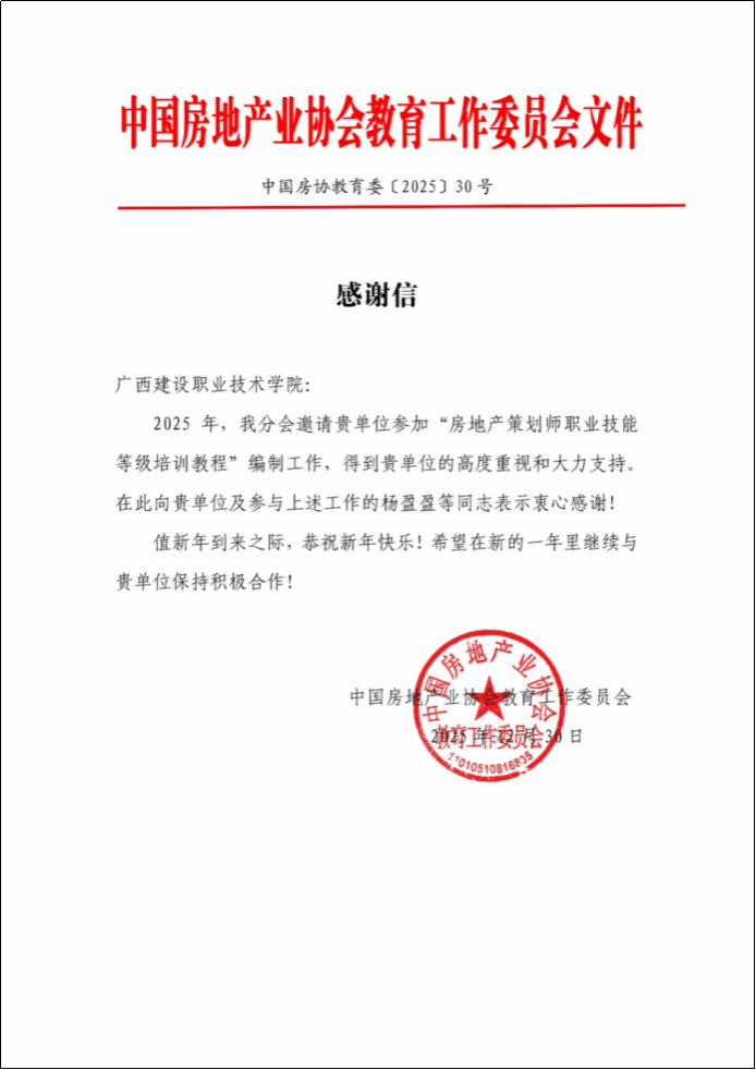 近日,中國房地產業協會教育工作委員會向我校發來感謝信,對我校教師在“房地產策劃師職業技能等級培訓教程”編制工作中作出的貢獻表示感謝。“房地產策劃師職業技能等級培訓教程”由國家人社部和中國房地產業協會牽頭組織編寫,旨在適應房地產行業數字化、智能化轉型的新趨勢,對該職業知識體系與能力要求進行系統性重構。該項目由我校管理工程學院楊盈盈教授牽頭,陳傲梅、林靖、蒙欣陽、何煜、唐龍遜、余彬、趙佳、李彥達等教師共同參與。...