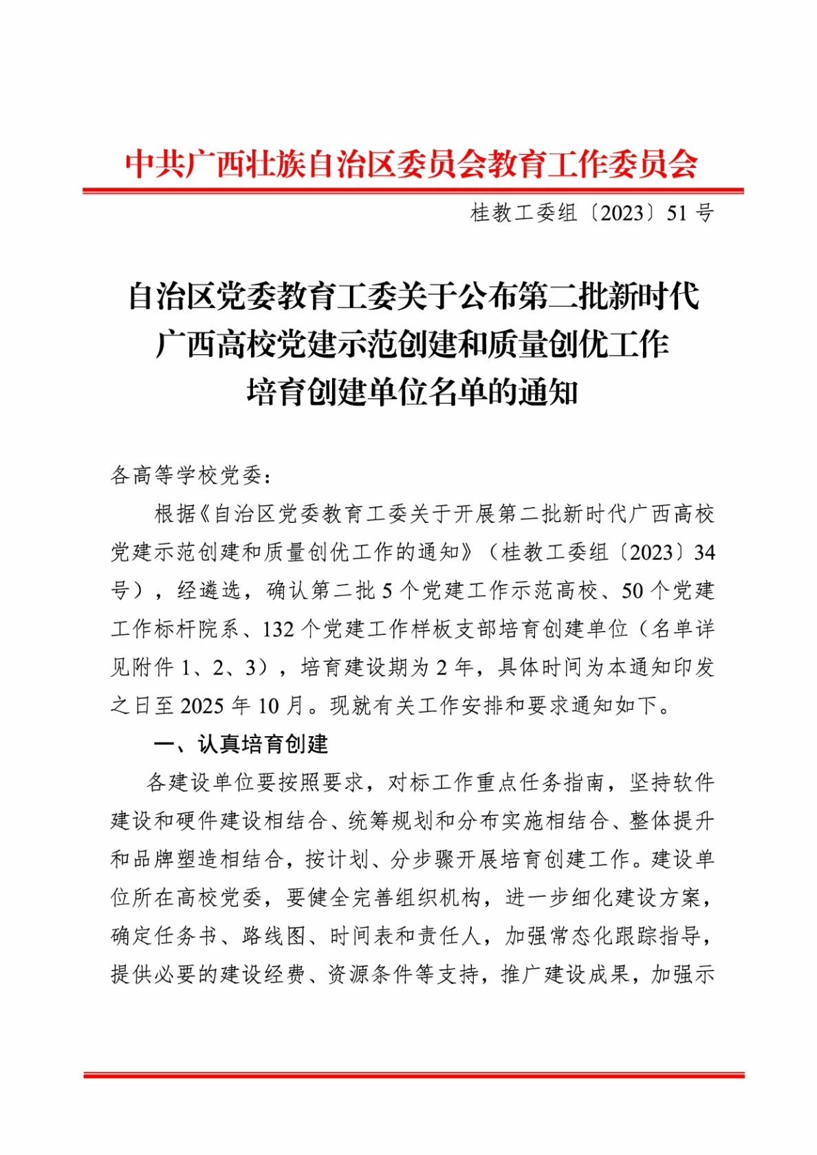 廣西建院9月16日訊(黨委組織部 潘金德)近日,中共廣西壯族自治區委員會教育工作委員會發布《自治區黨委教育工委關于公布第二批新時代廣西高校黨建示范創建和質量創優工作培育創建單位名單的通知》(桂教工委組〔2023〕51號),確認第二批5個黨建工作示范高校、50個黨建工作標桿院系、132個黨建工作樣板支部培育創建單位。其中,我校黨委被確認為廣西高校黨建工作示范高校培育創建單位,設備與環境學院黨總支被確認為廣西高校黨建工作標桿院系培育創建單位,市政與交通學院教工黨支部、建筑與規劃學院學生黨支部被確認為廣西高校黨建工作樣板支部培育創建單位。